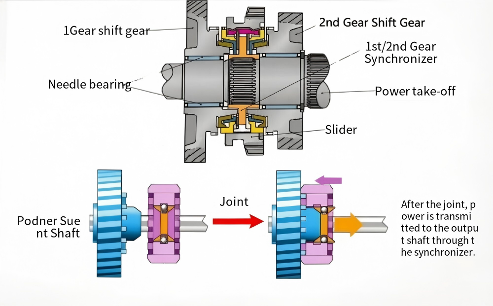 After engagement, power is transmitted to the output shaft through the synchronizer.